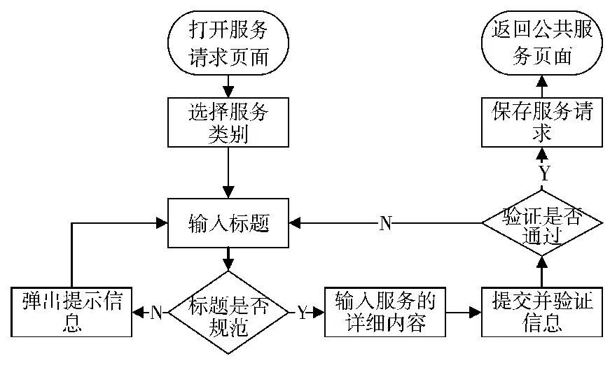 2、事務(wù)辦理。民眾在向政府部門(mén)提出事務(wù)辦理請(qǐng)求時(shí), 其過(guò)程為:首先, 民眾用戶打開(kāi)請(qǐng)求頁(yè)面, 選擇請(qǐng)求服務(wù)的類別, 然后輸入服務(wù)的標(biāo)題, 系統(tǒng)驗(yàn)證該標(biāo)題是否符合規(guī)范, 如果不符合規(guī)范則彈出提示信息, 并讓用戶重新輸入, 如果符合規(guī)范則輸入服務(wù)的詳細(xì)內(nèi)容, 最后提交給系統(tǒng)驗(yàn)證, 如果驗(yàn)證失敗將彈出驗(yàn)證失敗的提示信息, 反之則保存服務(wù)請(qǐng)求, 并返回到公共服務(wù)管理頁(yè)面。其流程如圖6所示。