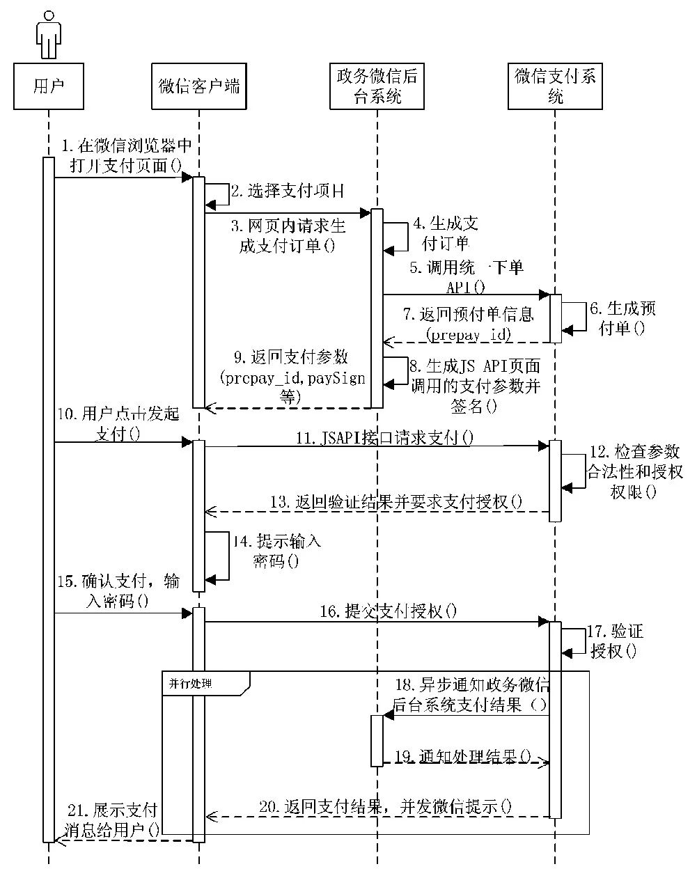 公眾提交個(gè)人信息后, 系統(tǒng)根據(jù)這些信息在數(shù)據(jù)庫(kù)中查詢待繳費(fèi)事項(xiàng)、金額等信息, 系統(tǒng)將這些信息以及政務(wù)微信的應(yīng)用表示App Id、用戶標(biāo)識(shí)Open Id、簽名Sign等參數(shù)封裝成XML, 并將該XML發(fā)送給微信的統(tǒng)一下單地址, 得到prepay_id, pay Sign等支付參數(shù)。公眾選擇待繳事項(xiàng)后, 進(jìn)入支付頁(yè)面。在支付頁(yè)面中, 輸入繳納金額后, 點(diǎn)擊支付, 發(fā)起支付請(qǐng)求。微信客戶端接收到支付請(qǐng)求后, 在頁(yè)面中調(diào)用JS API接口向微信支付系統(tǒng)請(qǐng)求支付, 并將得到的prepay_id, pay Sign等支付參數(shù)通過(guò)HTTPS協(xié)議傳輸給微信支付系統(tǒng)。微信支付系統(tǒng)驗(yàn)證得到的支付參數(shù)的合法性和支付發(fā)起域名的權(quán)限。驗(yàn)證通過(guò)后, 將驗(yàn)證結(jié)果返回給微信客戶端, 并要求用戶給予支付授權(quán)。此時(shí)支付頁(yè)面上會(huì)要求用戶輸入支付密碼, 用戶確認(rèn)支付并輸入支付密碼后, 微信支付系統(tǒng)驗(yàn)證該授權(quán)并完成支付操作。政務(wù)微信后臺(tái)系統(tǒng)收到支付結(jié)果后, 將支付信息加密存儲(chǔ)在數(shù)據(jù)庫(kù), 以便用戶可以查詢歷史支付記錄, 并且通知微信客戶端, 顯示支付成功頁(yè)面, 展示支付信息。繳納費(fèi)用的時(shí)序如圖7所示。