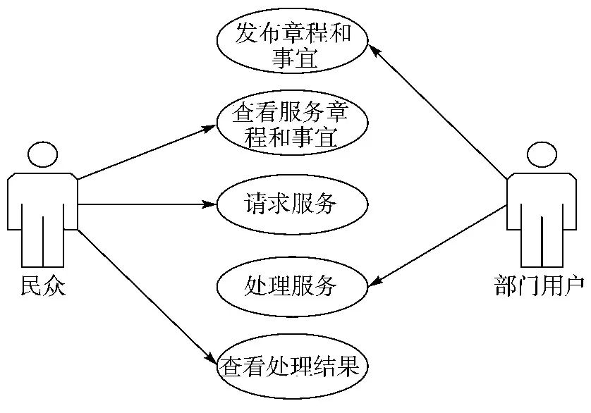 事務(wù)辦理是政府部門(mén)和廣大民眾的一個(gè)橋梁, 為廣大民眾提供了事務(wù)辦理流程查詢和辦理等功能, 更好地提升政府部門(mén)的公共服務(wù)能力。該模塊中主要包括5個(gè)子模塊, 即發(fā)布服務(wù)章程和事宜、查看服務(wù)章程和事宜、請(qǐng)求服務(wù)、辦理服務(wù)請(qǐng)求和查看辦理結(jié)果。其中, 由部門(mén)用戶負(fù)責(zé)完成的模塊是發(fā)布服務(wù)章程和辦理服務(wù)請(qǐng)求, 而民眾可以查看服務(wù)章程, 請(qǐng)求服務(wù)并查看請(qǐng)求的最終處理結(jié)果。其用例圖如圖3所示。