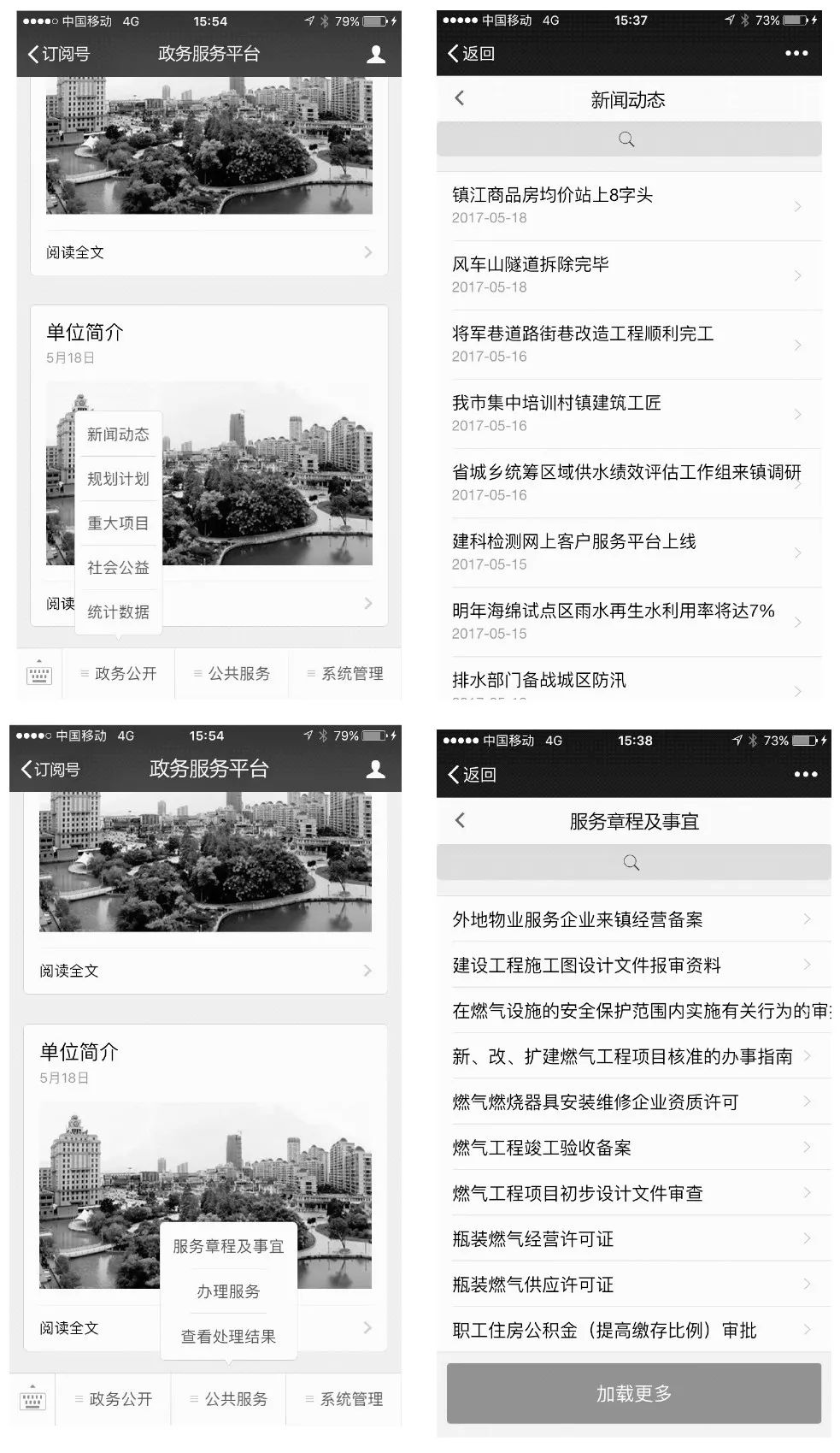 本平臺(tái)的后臺(tái)程序使用Java開(kāi)發(fā), 保證平臺(tái)的穩(wěn)定性與可靠性。前臺(tái)頁(yè)面基于HTML5、CSS3、Java 以及Ajax技術(shù)進(jìn)行設(shè)計(jì)和開(kāi)發(fā)。在保證功能性的同時(shí), 提升頁(yè)面的美觀程度, 并對(duì)用戶操作流程進(jìn)行優(yōu)化, 保證本平臺(tái)的用戶友好性, 使本平臺(tái)簡(jiǎn)潔、易使用。平臺(tái)的主界面為微信公眾號(hào)頁(yè)面, 通過(guò)設(shè)置微信公眾號(hào)的自定義菜單以及二級(jí)自定義菜單的跳轉(zhuǎn)鏈接, 來(lái)實(shí)現(xiàn)平臺(tái)的各個(gè)功能頁(yè)面。平臺(tái)的功能頁(yè)面主要有:新聞動(dòng)態(tài)、重大項(xiàng)目、統(tǒng)計(jì)數(shù)據(jù)、事務(wù)辦理、繳納費(fèi)用等。部分頁(yè)面如圖4所示。