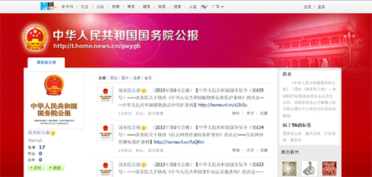 中華人民共和國國務(wù)院公報官方微博2月28日在新華網(wǎng)新華微博開通。國務(wù)院的重要政策法規(guī)文件等內(nèi)容將通過微博客這一新媒體形式集中、準(zhǔn)確、及時地向社會公眾公開。