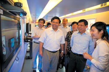 常務(wù)副市長楊雄(右二)等領(lǐng)導(dǎo)在中國電信上海公司總經(jīng)理張維華的陪同下,參觀電信的“信息生活體驗艙”。 王萬隆