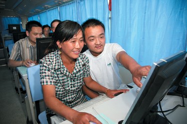 信息大篷車上,農(nóng)村學(xué)員興致勃勃地學(xué)習(xí)上網(wǎng)。 王萬隆