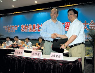 上海市信息委主任傅文彪(左)與中國電信上海公司總經(jīng)理張維華簽署“千村萬戶”農(nóng)村信息化培訓(xùn)協(xié)議。 王萬隆