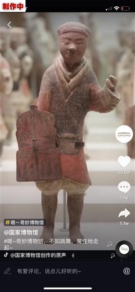 國(guó)博發(fā)布的短視頻中,“高冷”的陶男俑、陶女俑和說(shuō)書俑在音樂中“跳起舞來(lái)”。手機(jī)APP截圖