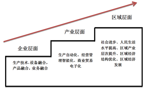 在企業(yè)層面,以信息技術與工業(yè)技術融合帶動生產(chǎn)設備、人力資源、自然資源等發(fā)生變化,導致生產(chǎn)要素層面發(fā)生融合,促進工業(yè)產(chǎn)品數(shù)字化、智能化、網(wǎng)絡化,催生業(yè)務流程融合、管理及經(jīng)營方式融合,以及最終產(chǎn)品的融合;在產(chǎn)業(yè)層面,發(fā)生在企業(yè)及行業(yè)中的生產(chǎn)要素、生產(chǎn)過程及產(chǎn)品的融合,導致產(chǎn)業(yè)的功能邊界被打破,促進了產(chǎn)業(yè)層面的融合。主要體現(xiàn)為生產(chǎn)自動化、經(jīng)營管理智能化、商業(yè)貿(mào)易電子化等;在區(qū)域層面,產(chǎn)業(yè)層面的融合促進了新型產(chǎn)業(yè)的衍生,并影響到經(jīng)濟增長方式的相應變化,從而使社會價值模式發(fā)生轉變,深入到生產(chǎn)實踐及現(xiàn)實生活的各個層面,促進社會進步和人民生活水平提高,以及區(qū)域經(jīng)濟的良好發(fā)展。
