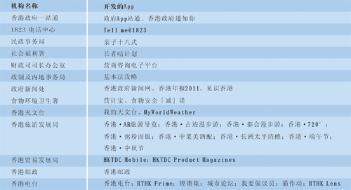 截至2012年11月底,香港特區(qū)政府24個公共機(jī)構(gòu)開發(fā)了56個App,主要涉及新聞、教育、衛(wèi)生、旅游、文化、環(huán)境、就業(yè)、出行、氣象等民生領(lǐng)域(見表1),如民政事務(wù)局提供的親子十八式、教育局提供的應(yīng)用學(xué)習(xí)、運輸署提供的香港乘車易。