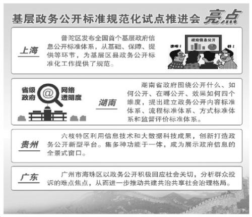 2017年5月9日,國辦發(fā)布“開展基層政務(wù)公開標準化規(guī)范化試點工作方案”通知,確定在北京、安徽、貴州等15省份100個縣(市、區(qū)),重點圍繞城鄉(xiāng)規(guī)劃、重大建設(shè)項目等方面開展基層政務(wù)公開標準化規(guī)范化試點工作。試點時間為期一年,各試點地方要在2018年8月底前完成試點各項任務(wù)。