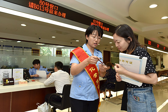 為提升行政效率、優(yōu)化營(yíng)商環(huán)境,西城區(qū)食藥監(jiān)局推出政務(wù)版“大堂經(jīng)理”——行政許可辦理引導(dǎo)員服務(wù)。張寶康攝