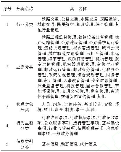 依據(jù)行業(yè)內(nèi)各部門現(xiàn)有的“三定方案”(定職能、定機構(gòu)、定編制)和工作職能,采用自上而下、線面結(jié)合的分類方法,梳理交通運輸政務(wù)信息資源分類體系。首先以行業(yè)領(lǐng)域及其運輸方式作為行業(yè)分類的主要依據(jù),然后依照各行業(yè)分類下的業(yè)務(wù)范圍作為業(yè)務(wù)分類的主要依據(jù),并在業(yè)務(wù)范圍內(nèi)從管理對象、管理業(yè)務(wù)行為的主題和信息資源的類別3個不同維度定位信息分類。最終形成了9個行業(yè)類目、35個業(yè)務(wù)類目以及11個管理對象類目、10種行為主題類目和3種信息類別類目的分類體系,分類結(jié)構(gòu)如圖1所示,類目名稱如表3所示。