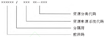 交通運輸政務(wù)信息資源代碼由前段碼、分隔符和后段碼3部分組成。其中,前段碼是交通運輸行業(yè)政府管理機構(gòu)編碼,表現(xiàn)為20位的字符串;分隔符為“/”;后段碼包括資源來源系統(tǒng)代碼和資源分類代碼,表現(xiàn)為17位的字符串。信息資源代碼的表示形式如圖2所示。