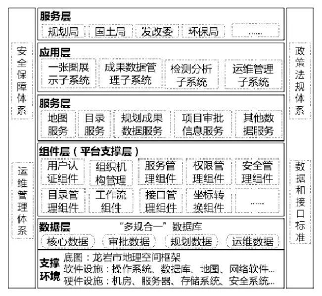 “多規(guī)合一”基礎(chǔ)信息平臺(tái)的系統(tǒng)架構(gòu)分為:支撐環(huán)境層、數(shù)據(jù)層、組件層、服務(wù)層、應(yīng)用層、用戶層, 以及數(shù)據(jù)和接口標(biāo)準(zhǔn)、安全保障體系、運(yùn)維保障體系和政策法規(guī)體系, 如圖1。