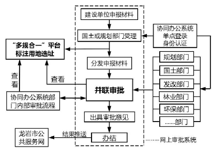 該流程有幾個(gè)弊端:一是召集各部門審批人員開會(huì)看現(xiàn)場(chǎng)需提前預(yù)約, 安排在大家都有空的時(shí)間;二是有些部門審批人員無法當(dāng)場(chǎng)決定, 要帶回本部門幾個(gè)業(yè)務(wù)科室共同審查;三是由于各部門的規(guī)劃目的不同, 內(nèi)容各有側(cè)重, 使用的信息手段、技術(shù)標(biāo)準(zhǔn)存在差異, 造成部分區(qū)域沖突, 該區(qū)域用地需多部門反復(fù)磋商, 影響審批時(shí)限;四是可能因?yàn)槟承┎块T未參與, 導(dǎo)致項(xiàng)目建設(shè)過程中出現(xiàn)無法預(yù)料的問題。