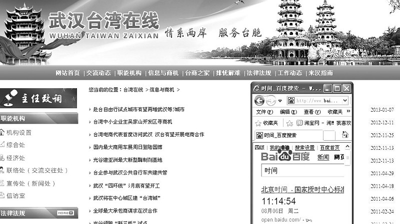 武漢市臺辦的網(wǎng)站“武漢臺灣在線”首頁上的“信息與商機(jī)”欄目中,最新的內(nèi)容為“赴臺自由行試點(diǎn)城市有望再增武漢等5城市”,錄入時間為今年1月7日;“臺商之家”欄目的最新錄入時間為2012年7月13日,內(nèi)容是武漢臺資企業(yè)協(xié)會舉行換屆大會,而第二條的更新時間為2011年2月16日。這意味著,臺商之家欄目,一年只更新了一條。