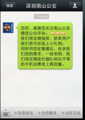 市民關(guān)注“深圳南山公安”微信平臺,可參加警方的抽獎,獲獎?wù)?,南山警方送水杯、u盤、鑰匙扣、公仔等小禮物,同時,南山警方通過微信征集建議,一經(jīng)采納,南山警方將在定期送價值5-30元不等的手機話費或者是上網(wǎng)流量。