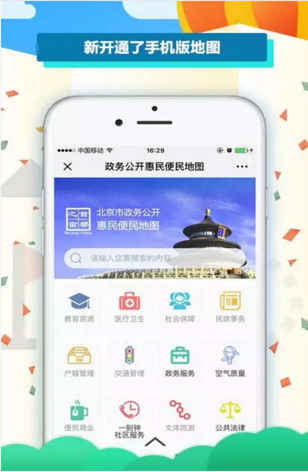 2017年,北京市政府辦公廳組織建設了政務公開惠民便民地圖,為大家提供教育、醫(yī)療、養(yǎng)老、保障房、政務服務等方面的地圖查詢服務。