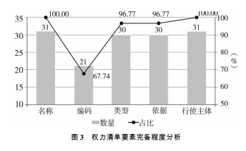 在清單標(biāo)準(zhǔn)化方面,全國31個(gè)省(自治區(qū)、直轄市)公布的省本級(jí)權(quán)力清單中,20個(gè)地區(qū)按照中辦、國辦印發(fā)的《關(guān)于推行地方各級(jí)政府工作部門權(quán)力清單制度的指導(dǎo)意見》相關(guān)要求,對其工作部門經(jīng)過確認(rèn)保留的行政職權(quán),以清單形式將每項(xiàng)職權(quán)的名稱、編碼、類型、依據(jù)、行使主體等要素內(nèi)容,對社會(huì)進(jìn)行了公開發(fā)布。進(jìn)一步分析得出,31個(gè)地區(qū)公布了事項(xiàng)的名稱和行使主體2項(xiàng)要素內(nèi)容,占比為100%;30個(gè)地區(qū)公布了事項(xiàng)的類型和實(shí)施依據(jù)2項(xiàng)要素內(nèi)容,占比為96.77%;行政事項(xiàng)統(tǒng)一權(quán)力編碼規(guī)范相對較弱,21個(gè)地區(qū)公布了事項(xiàng)的編碼,占比67.74%,如圖3所示。其中江蘇省進(jìn)行了“權(quán)力大普查”,涉及65家省級(jí)部門,最終編制完成《省市縣(市、區(qū))政府部門行政權(quán)力清單》,同時(shí)實(shí)現(xiàn)了相同行政權(quán)力事項(xiàng)在省市縣三級(jí)的權(quán)力名稱、類型、依據(jù)、編碼相統(tǒng)一。