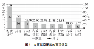在權(quán)力清單關(guān)聯(lián)性方面,權(quán)力事項(xiàng)各類型辦事指南同步推進(jìn),事項(xiàng)類型參照行政許可、行政處罰、行政強(qiáng)制、行政征收、行政給付、行政確認(rèn)、行政獎(jiǎng)勵(lì)、行政裁決和其他共9類事項(xiàng)。如圖4所示,全國31個(gè)省(自治區(qū)、直轄市)及新疆生產(chǎn)建設(shè)兵團(tuán)中,32個(gè)地區(qū)都已經(jīng)提供行政許可類辦事指南,覆蓋程度最為全面。