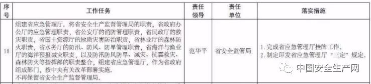 《改革方案》中將海南省安全生產(chǎn)監(jiān)督管理局的職責(zé),省政府辦公廳的應(yīng)急管理職責(zé),省公安廳的消防管理職責(zé),省民政廳的救災(zāi)職責(zé),省國(guó)土資源廳的地質(zhì)災(zāi)害防治職責(zé),省林業(yè)廳的森林防火職責(zé),省水務(wù)廳的防汛、防風(fēng)、防旱管理職責(zé),省海洋與漁業(yè)廳的海洋預(yù)報(bào)減災(zāi)職責(zé),以及防汛防風(fēng)防旱、減災(zāi)、抗震救災(zāi)、森林防火等指揮部的職責(zé)整合,組建省應(yīng)急管理廳,作為省政府組成部門(mén),按中央有關(guān)改革部署實(shí)施。