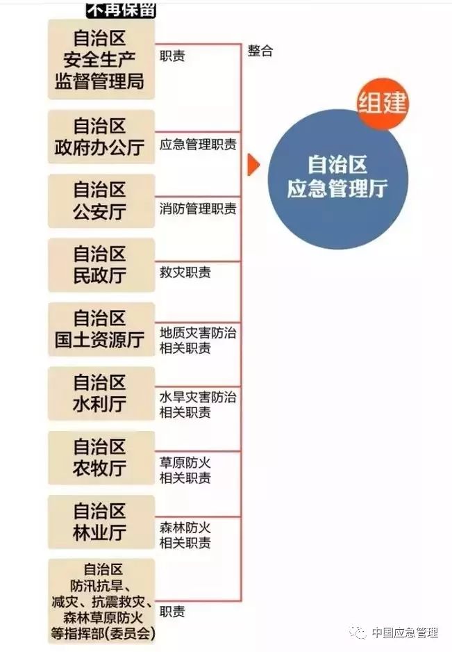 組建自治區(qū)應(yīng)急管理廳。為防范化解重特大安全風(fēng)險(xiǎn),整合優(yōu)化應(yīng)急力量和資源,提升防災(zāi)減災(zāi)救災(zāi)能力,將安全生產(chǎn)監(jiān)督管理局和政府辦公廳、公安廳、民政廳、國(guó)土資源廳、水利廳、農(nóng)牧廳、林業(yè)廳涉及應(yīng)急管理的職責(zé),以及自治區(qū)防汛抗旱、減災(zāi)、抗震救災(zāi)、森林草原防火等指揮部的職責(zé)整合,組建應(yīng)急管理廳。