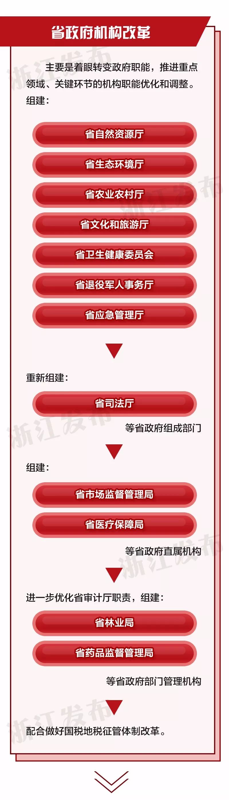 深化機構(gòu)改革,要認(rèn)真貫徹落實習(xí)近平總書記對浙江工作的重要指示精神,按照“干在實處永無止境,走在前列要謀新篇,勇立潮頭方顯擔(dān)當(dāng)”要求,從機構(gòu)職能上把加強黨的領(lǐng)導(dǎo)落實到各領(lǐng)域各方面各環(huán)節(jié),省市縣主要機構(gòu)設(shè)置同中央保持基本對應(yīng);以深化“最多跑一次”改革為牽引,加快政府職能轉(zhuǎn)變,使市場在資源配置中起決定性作用、更好發(fā)揮政府作用,強化社會管理和公共服務(wù)職能,切實解決人民群眾最關(guān)心最直接最現(xiàn)實的利益問題;統(tǒng)籌省市縣鄉(xiāng)各層級、黨政群各領(lǐng)域改革,優(yōu)化機構(gòu)設(shè)置和職能配置,提高效率效能;充分發(fā)揮法治規(guī)范和保障改革作用,在改革中完善和強化法治,堅決維護國家法制統(tǒng)一、政令統(tǒng)一、市場統(tǒng)一;結(jié)合浙江實際,因地制宜,大膽探索機構(gòu)設(shè)置和職能配置,構(gòu)建系統(tǒng)完備、科學(xué)規(guī)范、運行高效的機構(gòu)職能體系,再創(chuàng)體制機制新優(yōu)勢,為推進(jìn)“八八戰(zhàn)略”再深化、改革開放再出發(fā),加快浙江高水平全面建成小康社會、高水平推進(jìn)社會主義現(xiàn)代化建設(shè)提供堅強有力的體制機制保障。