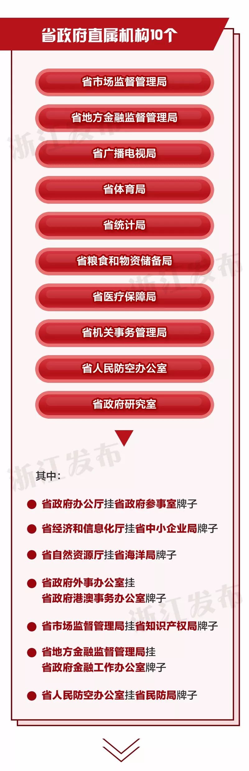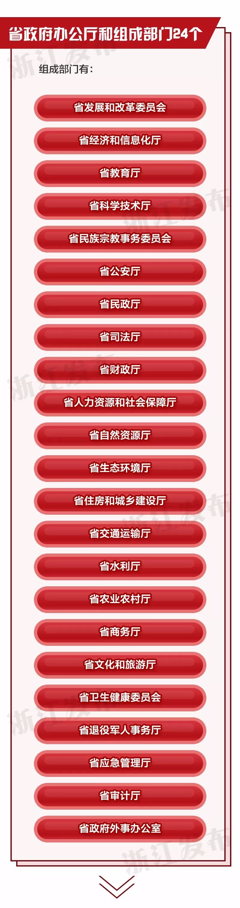 機構(gòu)改革后,共設(shè)置省級黨政機構(gòu)60個,其中省委機構(gòu)18個,省政府機構(gòu)42個。省委職能部門和省政府組成部門在機構(gòu)設(shè)置和職能配置上,與中央和國家機關(guān)基本對應(yīng)。同時,適應(yīng)浙江經(jīng)濟社會發(fā)展需要,在機構(gòu)限額內(nèi)因地制宜設(shè)置了部分機構(gòu),優(yōu)化調(diào)整一些領(lǐng)域的機構(gòu)職能。