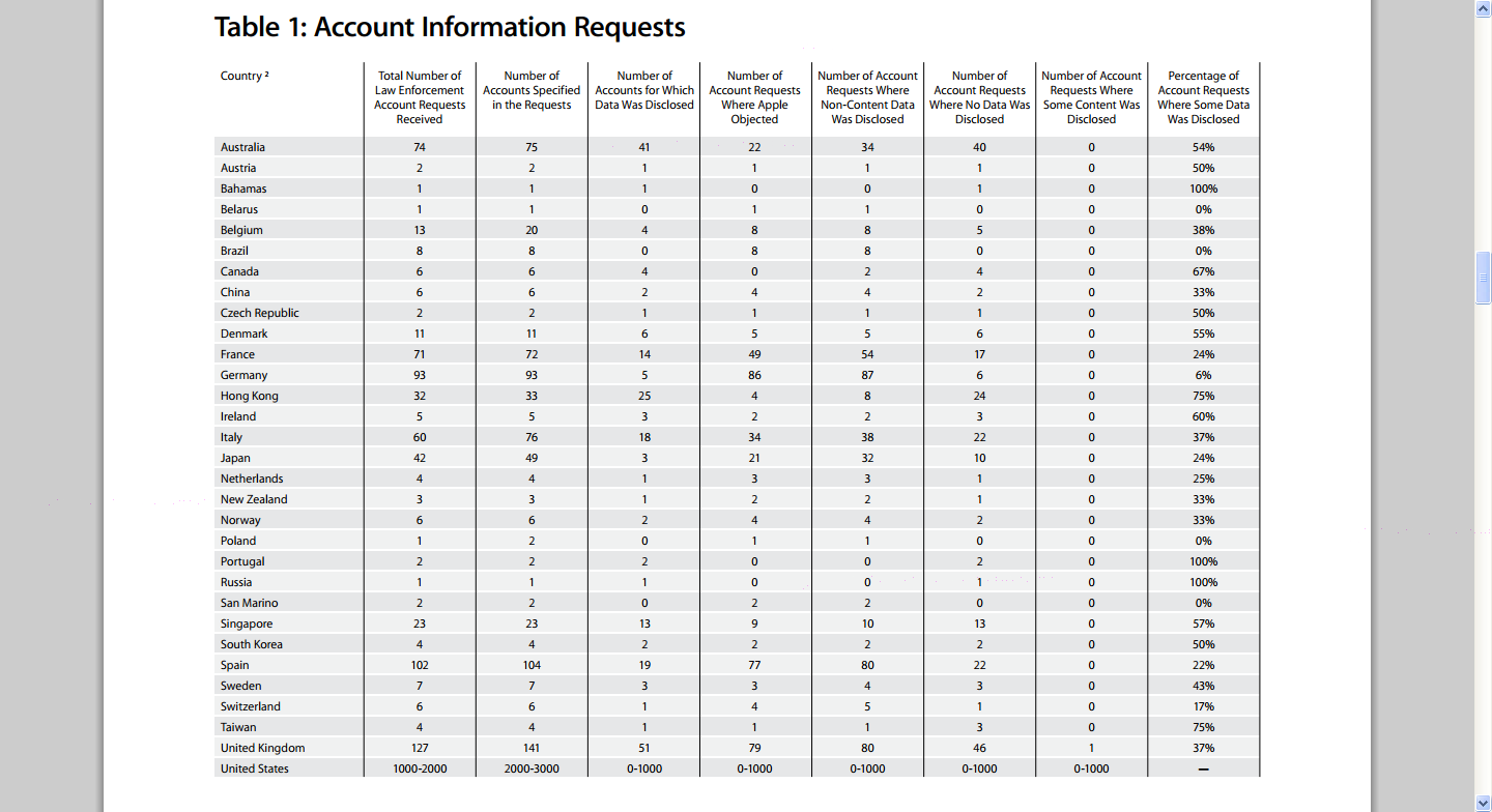 根據(jù)美國(guó)相關(guān)法律,蘋果等公司不允許公布美國(guó)政府要求保密的數(shù)據(jù)請(qǐng)求次數(shù),只允許公布美國(guó)政府允許公布的數(shù)據(jù)請(qǐng)求次數(shù)。即使如此,美國(guó)政府對(duì)蘋果的數(shù)據(jù)請(qǐng)求次數(shù)跟其他國(guó)家政府相比也遙遙領(lǐng)先。