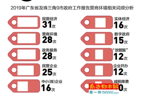 廣東省優(yōu)化營商環(huán)境改革將如何部署?記者從2019廣東省政府工作報告及珠三角9市政府工作報告中找答案。10份政府工作報告合計17.6萬多字,記者提取了與營商環(huán)境相關內(nèi)容近17000字,占總篇幅接近10%,并進行了分析。分析發(fā)現(xiàn)各地對優(yōu)化營商環(huán)境都做了相關部署,可見對營商環(huán)境的重視,深圳更定下明確目標:力爭達到相當于世界銀行發(fā)布的全球經(jīng)濟體營商環(huán)境排名前30名的水平。
