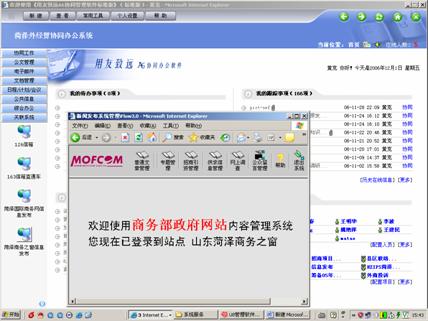 山東省外經(jīng)貿(mào)廳在《山東省外經(jīng)貿(mào)電子政務(wù)建設(shè)的調(diào)研報(bào)告》中指出:菏澤市外經(jīng)貿(mào)局在協(xié)同辦公方面,根據(jù)業(yè)務(wù)需要,有針對(duì)性的對(duì)辦公平臺(tái)軟件進(jìn)行選型,選擇國(guó)內(nèi)成熟的辦公軟件,實(shí)現(xiàn)了局機(jī)關(guān)內(nèi)部的辦公自動(dòng)化,辦公自動(dòng)化系統(tǒng)可以通過局域網(wǎng)登錄、網(wǎng)聯(lián)網(wǎng)登錄、門戶網(wǎng)站登錄三種方式登錄,可以將協(xié)同辦公信息轉(zhuǎn)發(fā)手機(jī)短信,做到隨時(shí)隨地的移動(dòng)辦公。菏澤市外經(jīng)貿(mào)局亦被山東省外經(jīng)貿(mào)廳評(píng)為2005年全省市級(jí)信息化先進(jìn)單位。