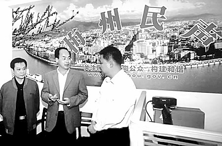 梅州市市委書記劉日知(中)最近到梅州市政府門戶網(wǎng)站了解“梅州民聲”的工作,現(xiàn)場(chǎng)辦公。照片來(lái)源:梅州日?qǐng)?bào)