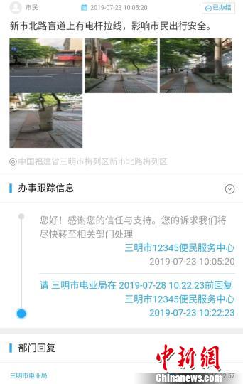 在三明市便民服務(wù)收到的眾多訴求件中,一條“點贊”信息引起記者的注意。一位市民寫道:“e三明”功能還是挺強大的,前天看到的訴求案件,今天就處理清楚了。供電公司響應(yīng)的速度也很快,才兩天時間,不僅把這條盲道上的拉線拆除了,還把旁邊的電桿也拆除了,點贊!