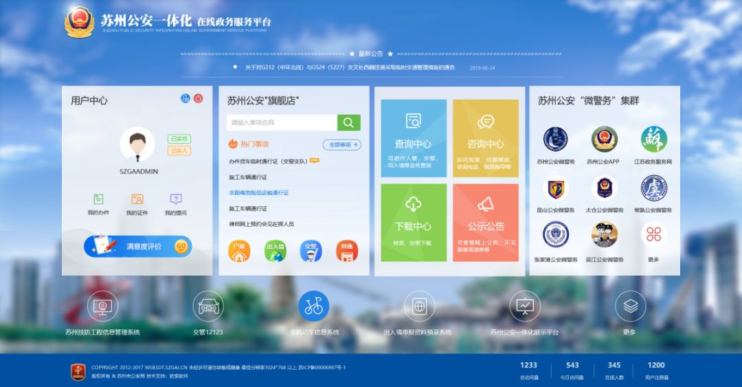 9月23日,蘇州公安“一體化在線政務服務平臺”(以下簡稱“一體化平臺”)正式上線啦!這是蘇州市公安局按照省廳總體部署,歷時近6個月的開發(fā)建成的全新平臺,是全省地級市中第一個上線的“一體化平臺”,將為大家提供更便捷、更智能、更安全的公安在線政務服務。