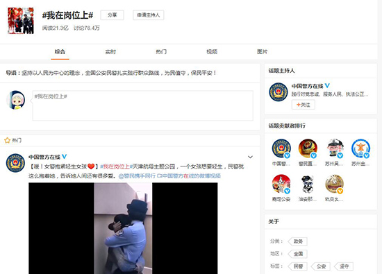 公安部發(fā)起的“我在崗位上”活動,在微博上閱讀21.3億,討論78.4萬。