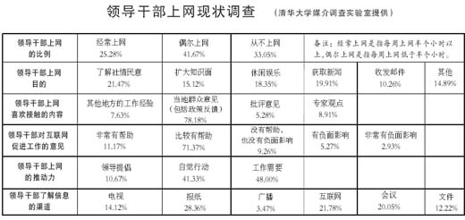 近日,清華大學(xué)媒介調(diào)查實(shí)驗(yàn)室的一次調(diào)查問卷顯示,在629名地方黨政縣處級(jí)以上領(lǐng)導(dǎo)中,25.28%的干部經(jīng)常上網(wǎng),41.67%的干部偶爾上網(wǎng)。近70%的干部有“觸網(wǎng)”的經(jīng)歷。