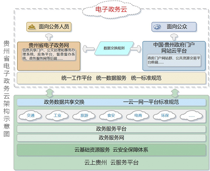 2014年以來,按照省委、省政府關(guān)于發(fā)展大數(shù)據(jù)的戰(zhàn)略部署,貴州省政府辦公廳以提升行政效能、創(chuàng)新社會(huì)管理、完善公共服務(wù)為目標(biāo),全力打造“電子政務(wù)云”。圖為貴州省電子政務(wù)云架構(gòu)示意圖(貴州省政府辦公廳供圖)