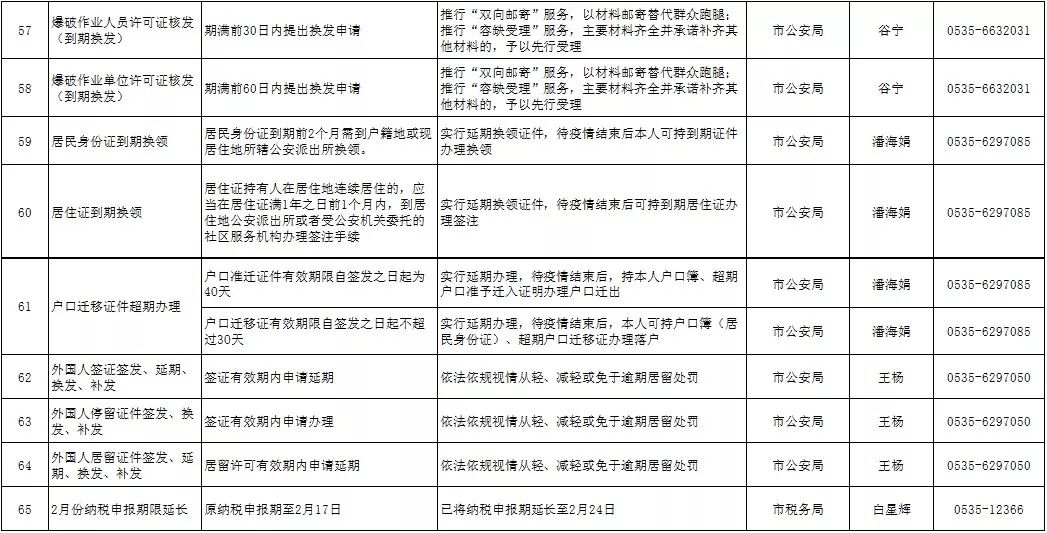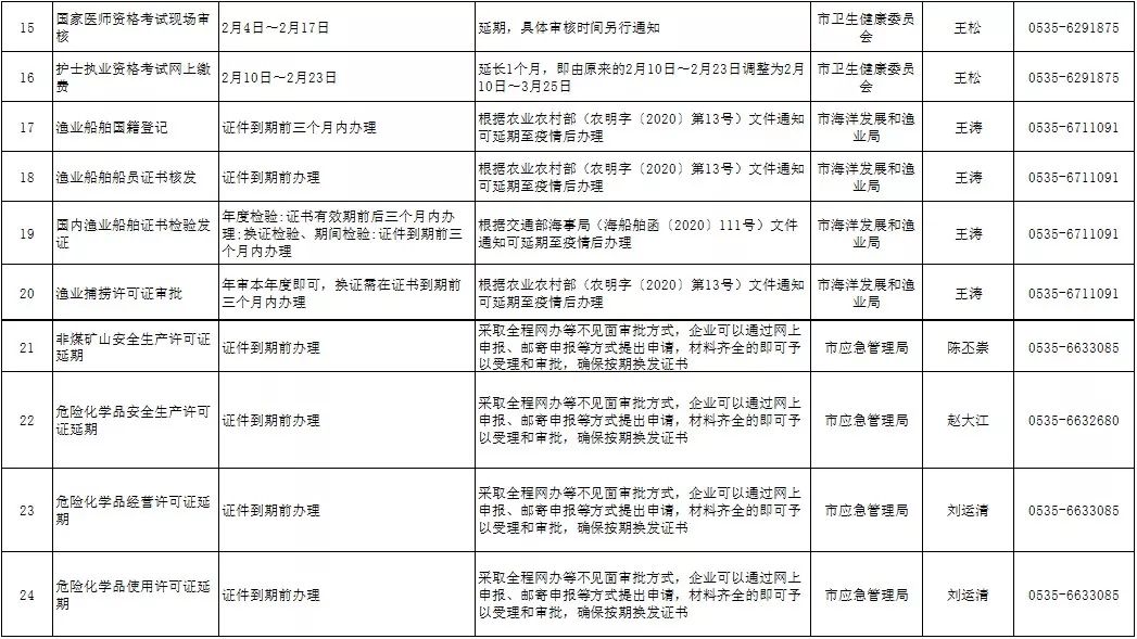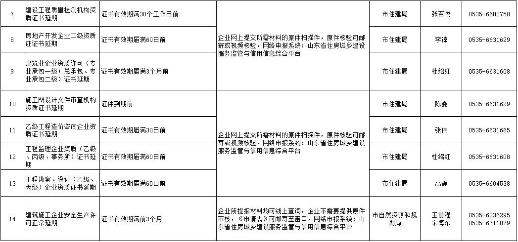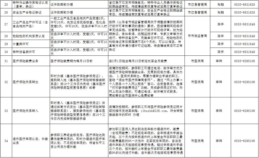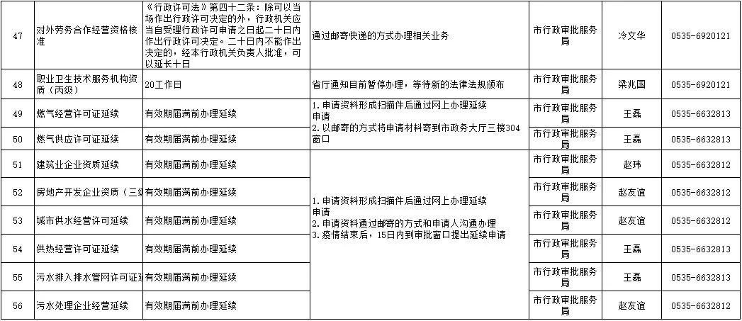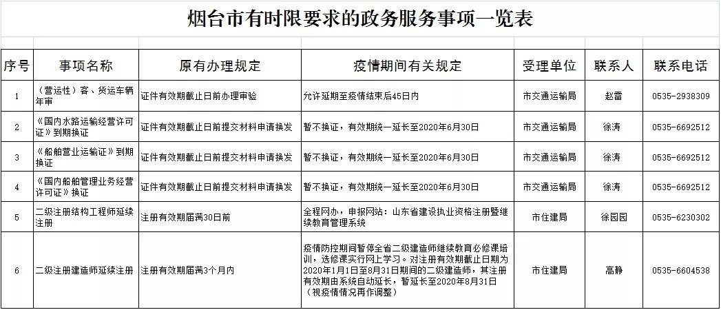 為保障疫情防控和政務(wù)服務(wù)兩不誤,煙臺市政務(wù)服務(wù)管理辦公室梳理出三大類65項有時限要求的政務(wù)服務(wù)事項。其中有56項可網(wǎng)上辦、延期辦,具體包括:建設(shè)工程質(zhì)量檢測機構(gòu)資質(zhì)證書延期、施工圖設(shè)計文件審查機構(gòu)資質(zhì)證書延期等30項,(營運性)客、貨運車輛年審、居民身份證到期換領(lǐng)等26項。另有,檢驗檢測機構(gòu)資質(zhì)認定等9個事項暫停受理,將根據(jù)疫情防控形勢,由國家、省相關(guān)行政主管部門確定具體恢復(fù)時間。詳細情況公布如下: