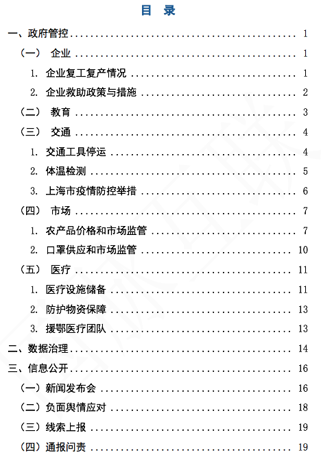 摘要:新型冠狀病毒感染的肺炎疫情發(fā)生以來,上海市按照黨中央、國務(wù)院的決策部署,在市新型冠狀病毒感染的肺炎疫情防控工作領(lǐng)導(dǎo)小組統(tǒng)一指揮下,出臺了一系列防控法規(guī)、政策和舉措。本報告采集上海市及其下轄16區(qū)的防控疫情相關(guān)數(shù)據(jù),從政府管控、數(shù)據(jù)治理、信息公開三個維度進(jìn)行數(shù)據(jù)采集、分析,總體來看上海市與16個市轄區(qū)政府在企業(yè)、教育、交通、市場等領(lǐng)域均開展了相關(guān)防疫的工作措施,通過市政務(wù)服務(wù)平臺、官方App、微信公眾號等渠道快速搭建了相關(guān)疫情服務(wù)平臺,提供疫情信息發(fā)布、疫情線索申報、醫(yī)療服務(wù)、同行程人員查詢、口罩預(yù)約等服務(wù),同時各級政府也通過新聞發(fā)布會等及時進(jìn)行疫情通報、防護(hù)知識普及與辟謠。而新技術(shù)的應(yīng)用在此次疫情防控中也各顯其能,助力研判分析疫情,加強(qiáng)疫情聯(lián)防聯(lián)控,保證經(jīng)濟(jì)恢復(fù)高效運(yùn)行。