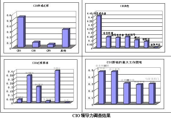 《信息周刊》最近對中國CIO領(lǐng)導力進行了調(diào)查,調(diào)查結(jié)果顯示:45%的中國CIO直接向總裁或CEO匯報工作,而其他CIO向COO、CFO或者其他高級經(jīng)理層匯報;只有8%的CIO在組織中扮演著組織戰(zhàn)略家的角色,大多(41%)CIO還只是扮演著項目推動者的角色;只有38%的CIO至少每周向直接主管匯報,而多達40%的CIO沒有固定時間向主管匯報;將近一半(47%)的CIO任務自己最大的困難是業(yè)務目標和IT項目間缺乏統(tǒng)一性和員工素質(zhì)和能力有待提高。(信息周刊 2006)