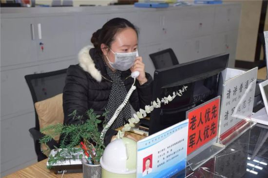 圖為窗口工作人員正在通過電話與辦事群眾進行溝通