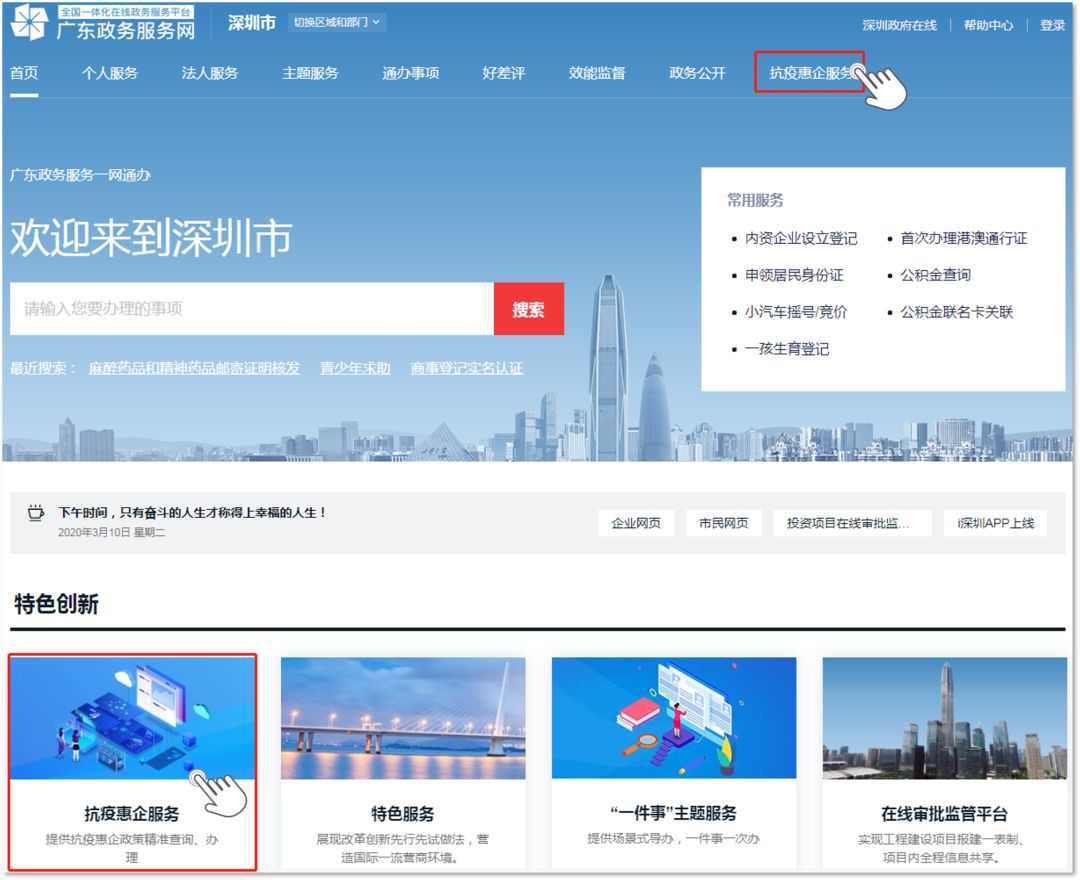 渠道三 “廣東政務服務網深圳站”首頁的導航菜單或“特色創(chuàng)新”版塊點擊“抗疫惠企服務”。