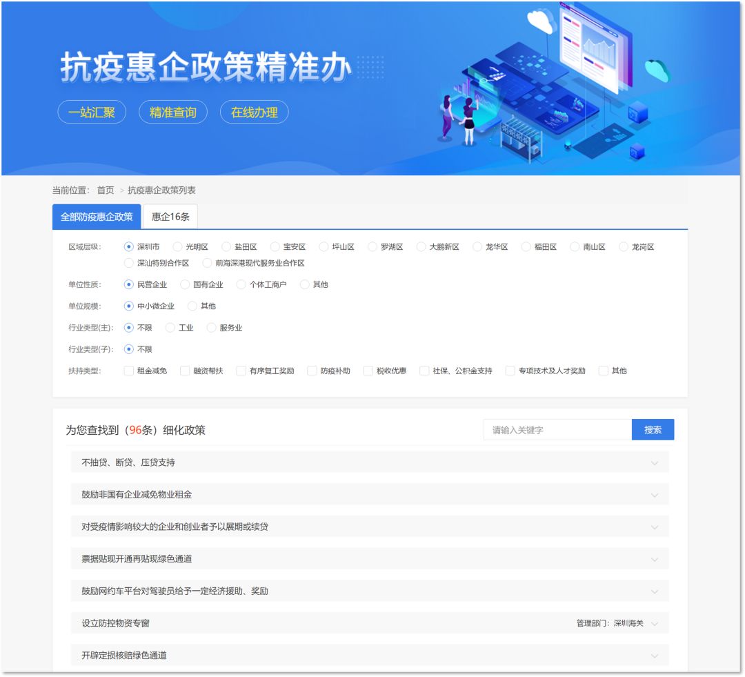 進入深圳市“深i企-抗疫惠企政策精準辦”界面后,企業(yè)可通過“輸入關鍵字”的方式進行自行檢索政策,或通過區(qū)域層級、單位性質、單位規(guī)模、行業(yè)類型、扶持類型等多條件勾選方式實現標簽式、定位式政策查詢。