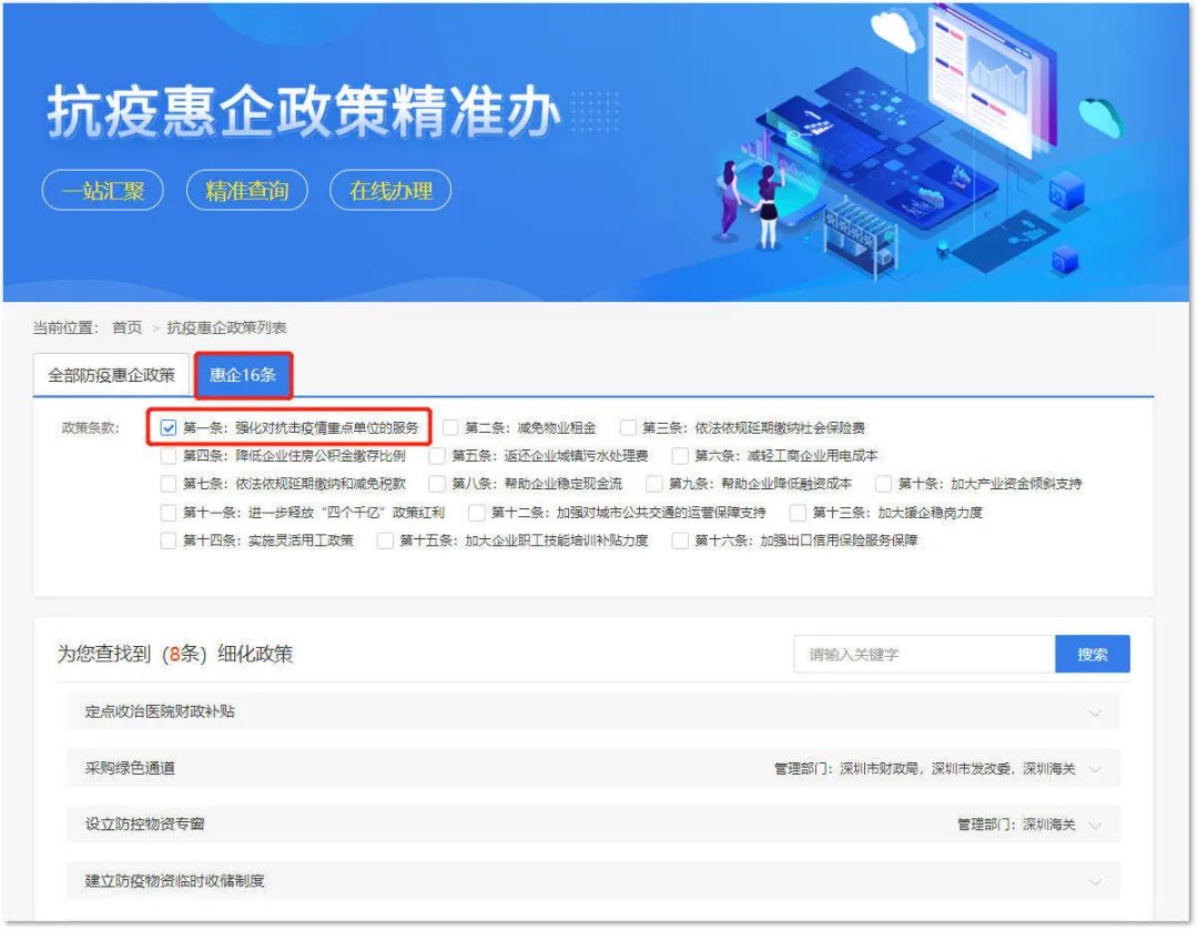 進入深圳市“深i企-抗疫惠企政策精準辦”界面后點擊“惠企16條”,企業(yè)可通過勾選政策條款的方式,檢索到每一條政策包含的政策點,精準地定位到相應的服務事項。