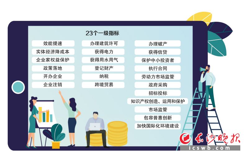 今年,長沙重點(diǎn)針對企業(yè)開辦、企業(yè)注銷、獲得建筑許可等23個(gè)重要方面優(yōu)化營商環(huán)境。其中,23個(gè)一級指標(biāo)分別為效能提速,實(shí)體經(jīng)濟(jì)降成本,企業(yè)家權(quán)益保護(hù),政策落地,開辦企業(yè),企業(yè)注銷,辦理建筑許可,獲得電力,獲得用水用氣,登記財(cái)產(chǎn),納稅,跨境貿(mào)易,辦理破產(chǎn),獲得信貸,保護(hù)中小投資者,執(zhí)行合同,勞動(dòng)力市場監(jiān)管,政府采購,招標(biāo)投標(biāo),知識產(chǎn)權(quán)創(chuàng)造、運(yùn)用和保護(hù),市場監(jiān)管,包容普惠創(chuàng)新,加快國際化環(huán)境建設(shè)。