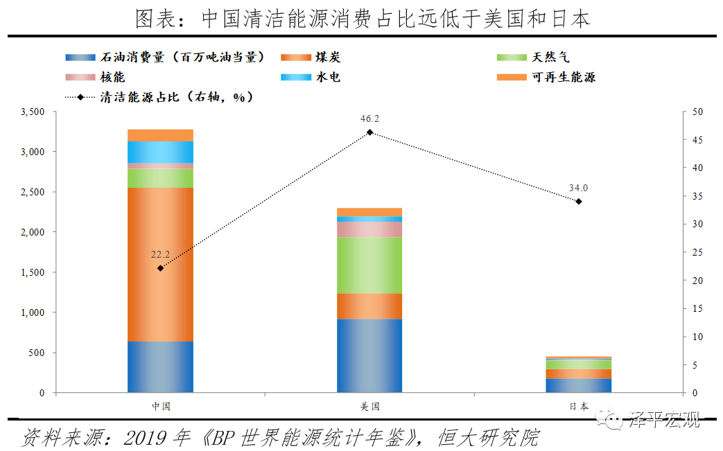 在清潔能源消費(fèi)比例方面,根據(jù)2019年《BP世界能源統(tǒng)計年鑒》,2018年中國能源消費(fèi)中煤炭、石油、天然氣、水電、核能、可再生能源分別占比58.2%、19.6%、7.4%、8.3%、2.0%和4.4%,清潔能源合計占22.1%;而美國分別占比13.8%、40.0%、30.5%、2.8%、8.4%和4.5%,清潔能源占46.2%;日本分別占比25.9%、40.2%、21.9%、4.0%、2.4%和5.6%,清潔能源占34.0%。
