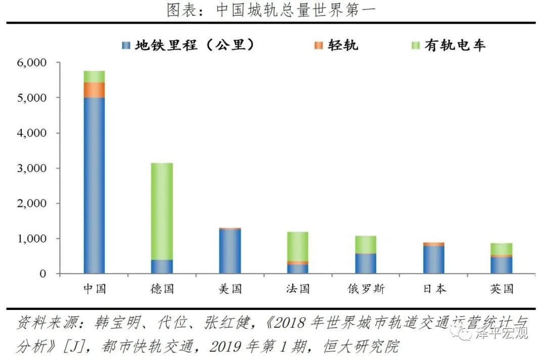 4)城軌:中國軌道交通里程居世界第一,人均高于美國,但低于日英法德俄。按照國際較為常用的分類方法,城軌分為地鐵、輕軌和有軌電車三類,從總量上看,根據(jù)《2018年世界城市軌道交通運(yùn)營統(tǒng)計與分析》,我國城軌里程共計5766.7公里,位居世界第一,占全球總里程的22.09%;其中地鐵、輕軌和有軌電車?yán)锍谭謩e為5013.3、420.8和332.6公里,分別占全球地鐵和輕軌里程的35.3%、32.5%和3.1%,地鐵、輕軌里程也是世界第一。但從人均來看,中國人均城軌里程4.1公里/百萬人,高于美國的4.0,但低于日本的7.0、英國的13.1、法國17.7、德國的38.0和俄羅斯的7.5。