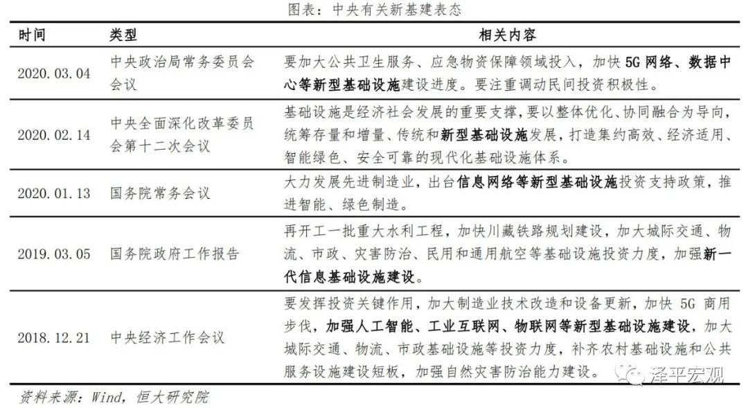 中央近期密集點名新基建,其內(nèi)涵不應(yīng)局限在信息領(lǐng)域。新基建在2018年12月中央經(jīng)濟(jì)工作會議被第一次提及,2019年寫入國務(wù)院政府工作報告,2020年1月國務(wù)院常務(wù)會議、2月中央深改委會議、3月中央政治局常委會議持續(xù)密集部署。從中央會議內(nèi)容看,新基建側(cè)重于5G網(wǎng)絡(luò)、數(shù)據(jù)中心、人工智能、工業(yè)互聯(lián)網(wǎng)、物聯(lián)網(wǎng)等新一代信息技術(shù)。