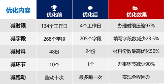 前期,建行山東省分行配合省政府辦公廳完成100個(gè)“一件事”主題式服務(wù)和100個(gè)高頻民生服務(wù)事項(xiàng)的流程優(yōu)化。以“我要開營利性養(yǎng)老院”主題為例,通過線上辦理、并聯(lián)審批、數(shù)據(jù)共享、容缺受理或告知承諾等途徑進(jìn)行流程優(yōu)化,辦理時(shí)限可壓縮97%,填寫字段數(shù)減少23.5%,材料份數(shù)最高可優(yōu)化50%,跑動次數(shù)降低至1次,實(shí)現(xiàn)全程網(wǎng)辦。