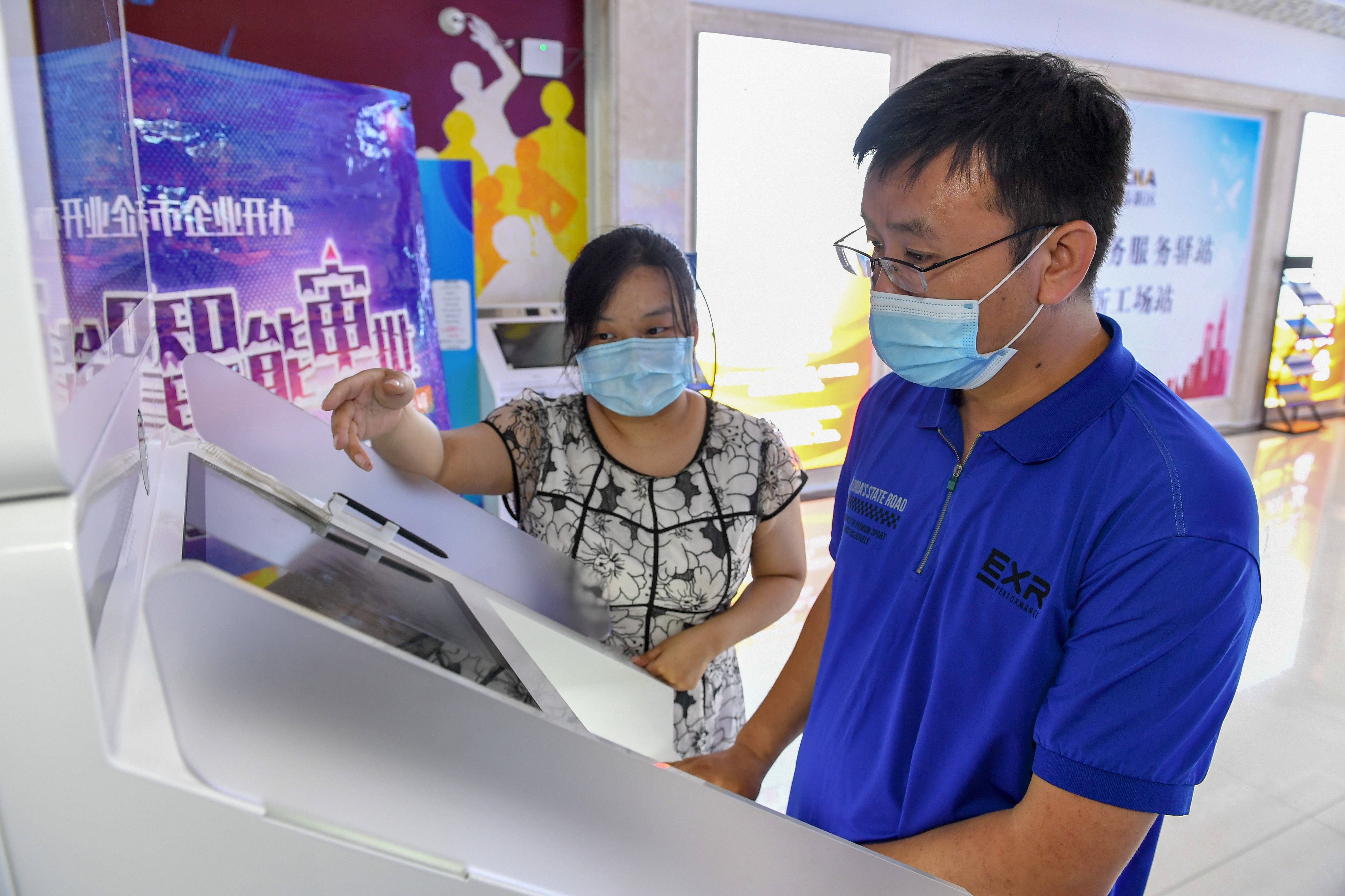 6月16日,在長(zhǎng)春新區(qū)政務(wù)服務(wù)驛站擺渡創(chuàng)新工場(chǎng)站,某企業(yè)負(fù)責(zé)人(右)在工作人員的協(xié)助下,使用自助服務(wù)終端機(jī)辦理審批業(yè)務(wù)。