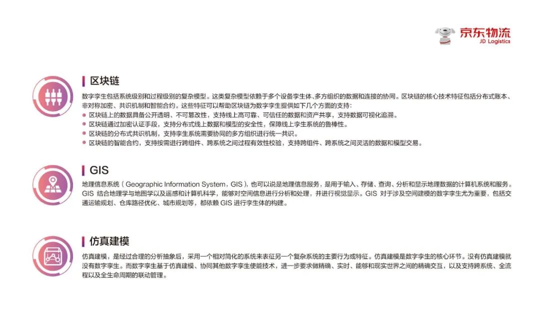 除此之外,區(qū)塊鏈技術(shù)是數(shù)字孿生建設(shè)的又一個重要支撐技術(shù)。在數(shù)字孿生供應(yīng)鏈建設(shè)中,京東物流面對信息不透明導(dǎo)致的信任隔閡,創(chuàng)新性地推出了基于區(qū)塊鏈技術(shù)的“京源鏈”產(chǎn)品,通過結(jié)合大數(shù)據(jù)、物聯(lián)網(wǎng)、GIS地圖、區(qū)塊鏈等技術(shù)和設(shè)備,實現(xiàn)了農(nóng)產(chǎn)品的全程信息可視化追溯,并按照“一物一碼”標(biāo)準(zhǔn),實現(xiàn)溯源信息的公開和透明。