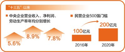 國(guó)企規(guī)模實(shí)力持續(xù)增強(qiáng),效益穩(wěn)步提高。預(yù)計(jì)到今年底,中央企業(yè)資產(chǎn)總額將接近69萬(wàn)億元,比“十二五”末增長(zhǎng)45%?!笆濉币詠?lái),中央企業(yè)營(yíng)業(yè)收入、凈利潤(rùn)、勞動(dòng)生產(chǎn)率年均分別增長(zhǎng)5.6%、8.9%、7.8%,進(jìn)入世界500強(qiáng)的中央企業(yè)達(dá)到48家。民企改革發(fā)展成效顯著?!笆濉币詠?lái),民營(yíng)企業(yè)500強(qiáng)門檻從2016年的100億元提升至2020年的200億元;創(chuàng)新創(chuàng)業(yè)創(chuàng)造熱情高漲,中小企業(yè)數(shù)量增長(zhǎng)近1倍。